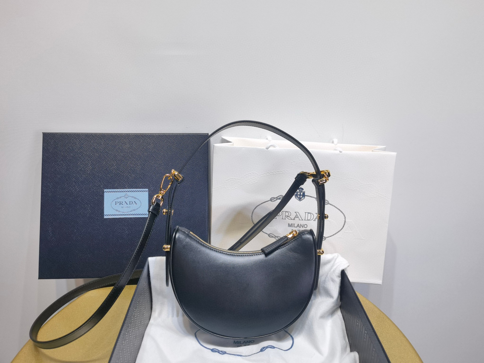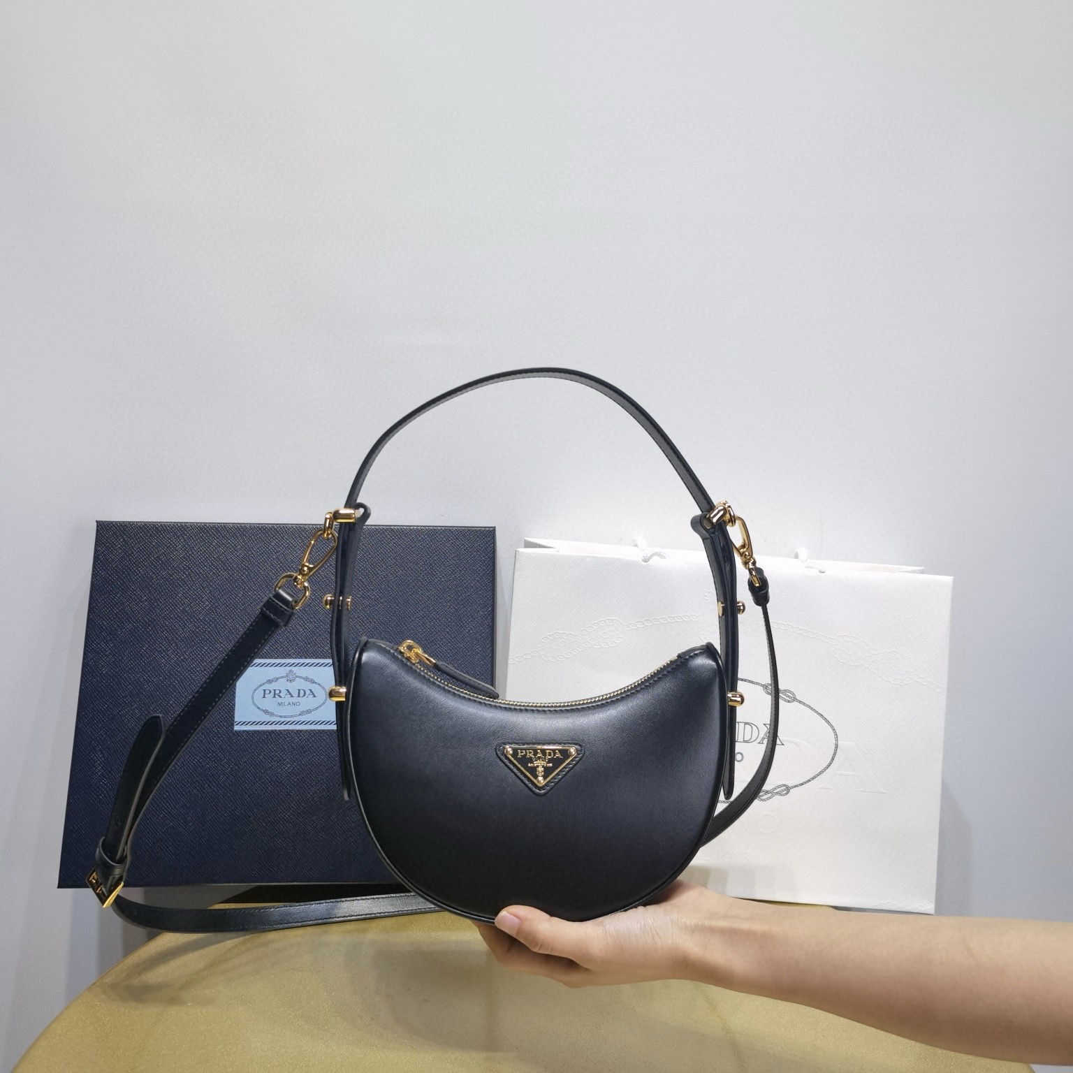 月牙型手袋,時尚百搭。內裏小羊皮。這款迷你手袋呈現流暢的曲線廓形,充滿現代魅力。風格百搭,外形小巧,選用小牛皮面料,綴飾精致細節與亮澤的金屬五金配件。飾有塗琺瑯三角形金屬徽標。可單肩背可腋下背,可手提可斜挎,隨心打造不同造型搭配