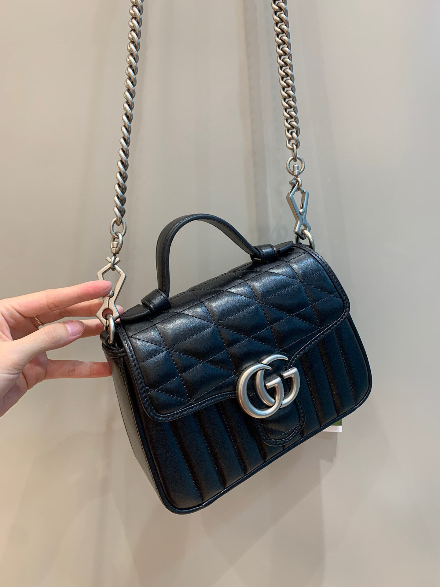 在2019早春系列中,GG Marmont家族再添新成員,這款GG Marmont系列迷你手提包結構柔軟,超大造型翻蓋扣飾以雙G造型配件。配以皮革提手和鏈式肩帶,絎縫V型皮革材質,背面飾有心形圖案。