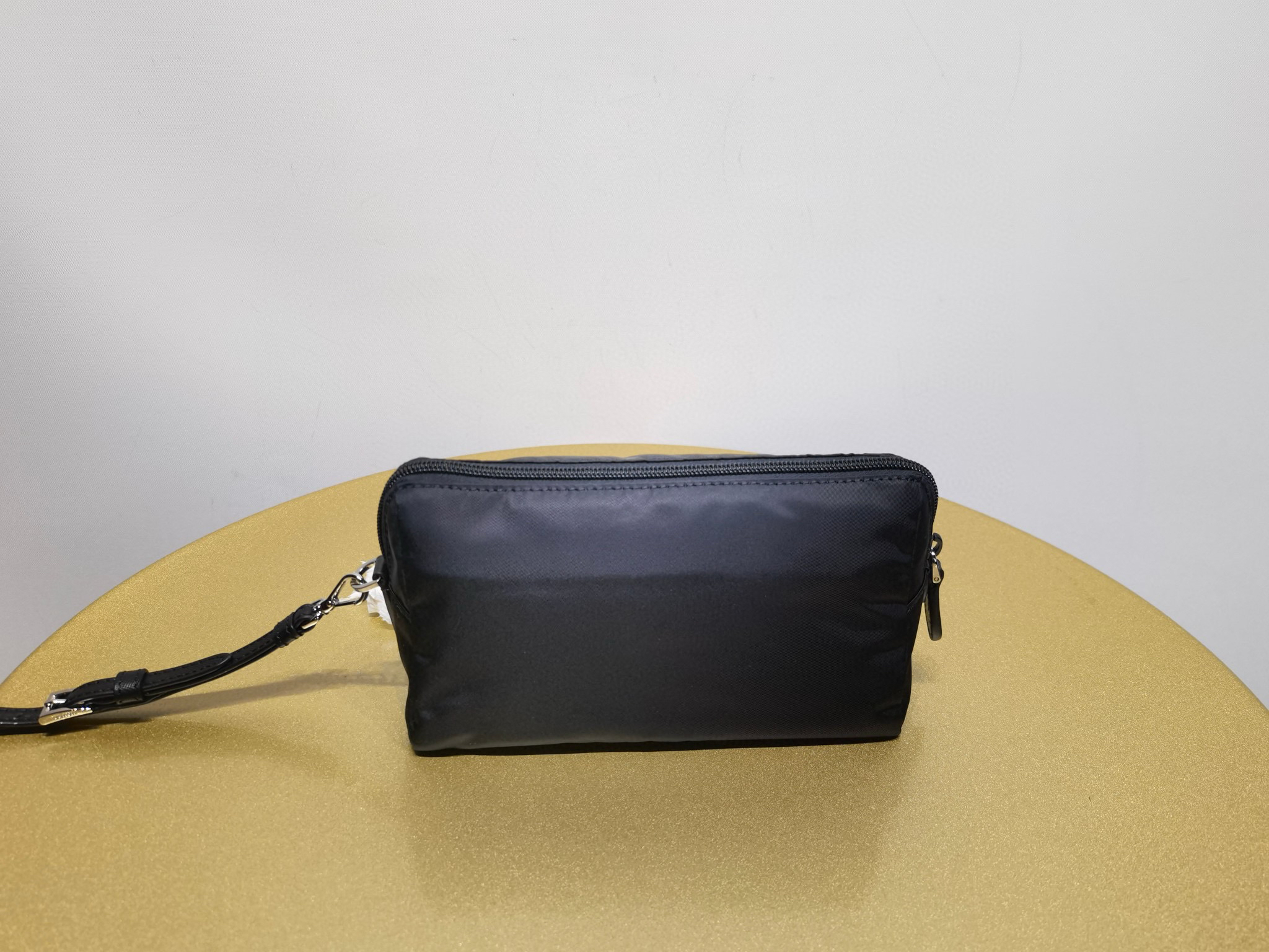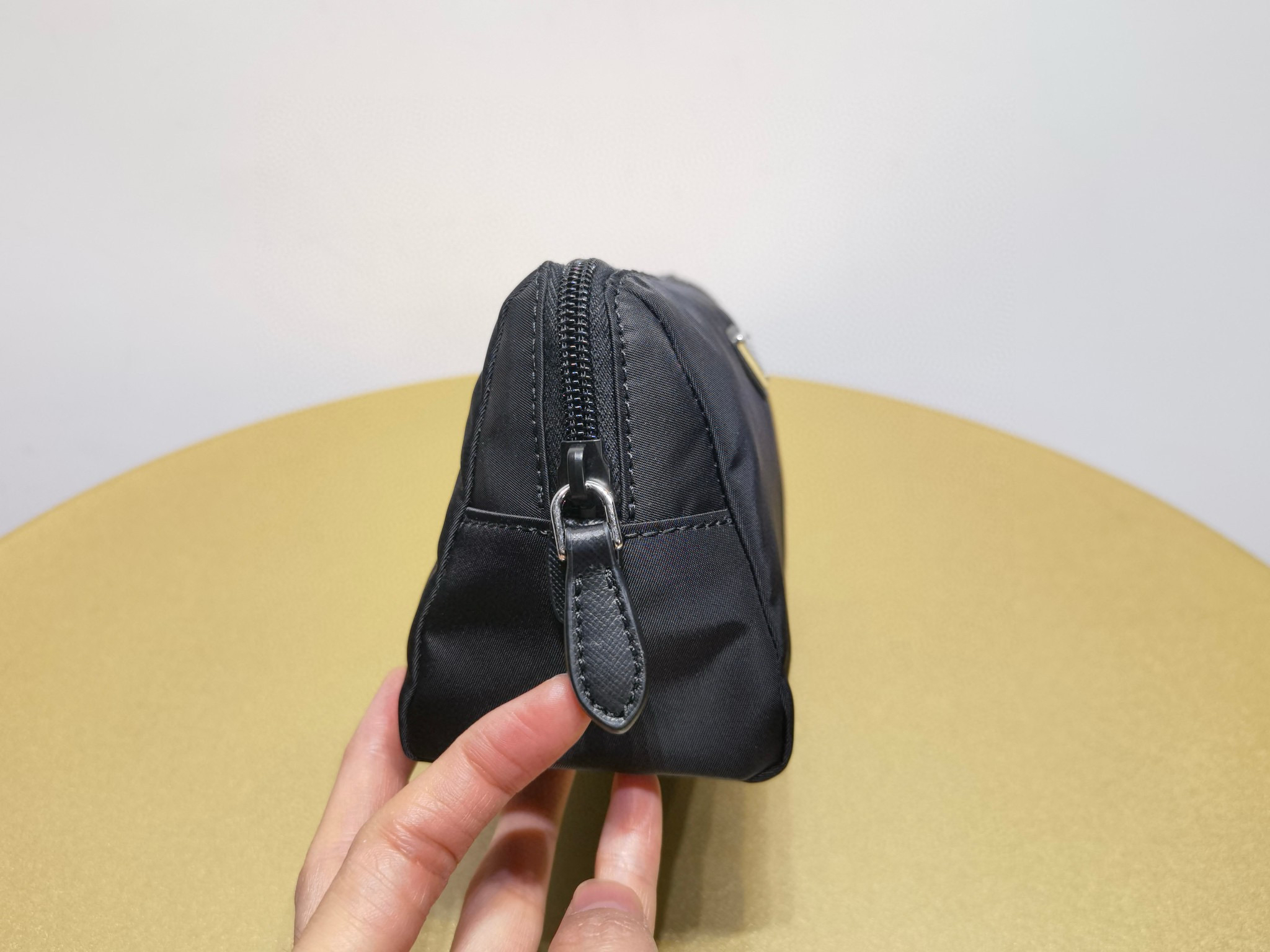 這款化妝包采用Re-Nylon再生尼龍打造,設計簡約,輕便實用,設有可調節皮提手。拉鏈開合,內部一個拉鏈式口袋。飾以塗琺瑯三角形徽標和Saffiano牛皮細節
