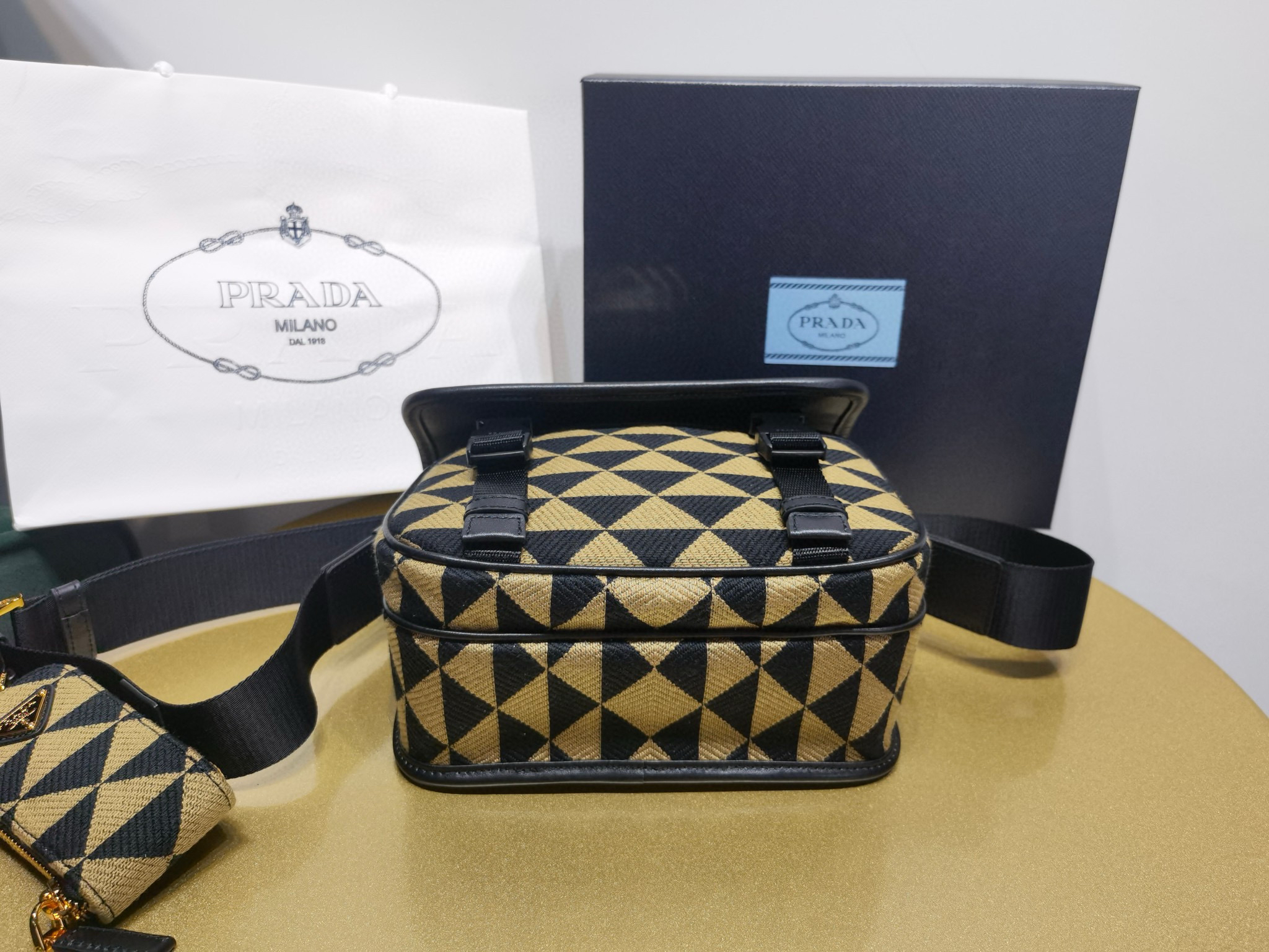 可拆卸可調式尼龍和皮革肩帶,配可拆卸口袋 正面塗琺瑯金屬三角形徽標 翻蓋和按扣開合系統 背面拉鏈式口袋 Re-Nylon再生尼龍襯裏,飾字母徽標