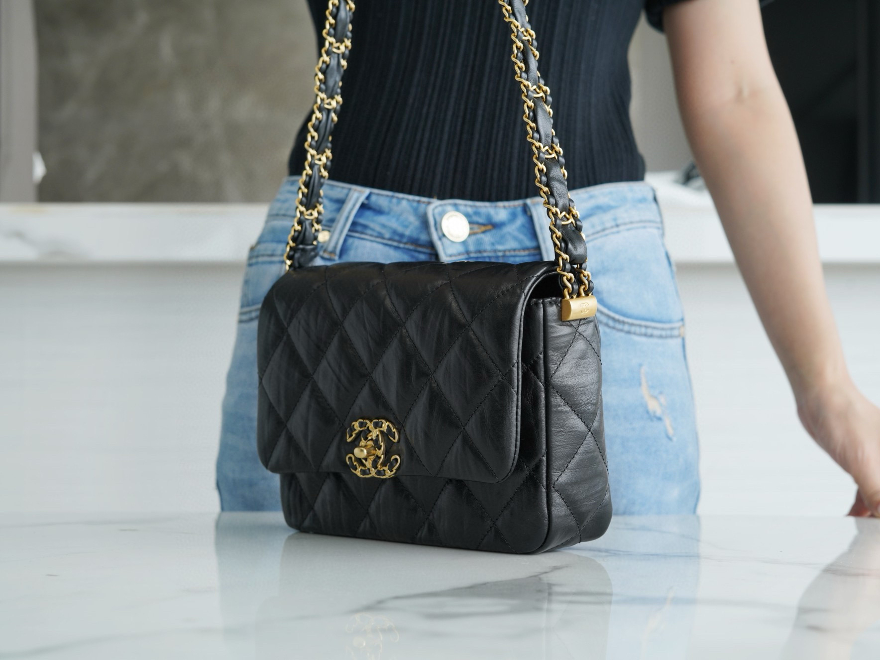 寬肩帶黑金褶皺牛皮,經典菱格紋設計與皮穿金屬的鏈條搭配,延續了19的經典元素,超級顯精致~斜挎單背都超颯,隨性 簡單、上身自帶時髦