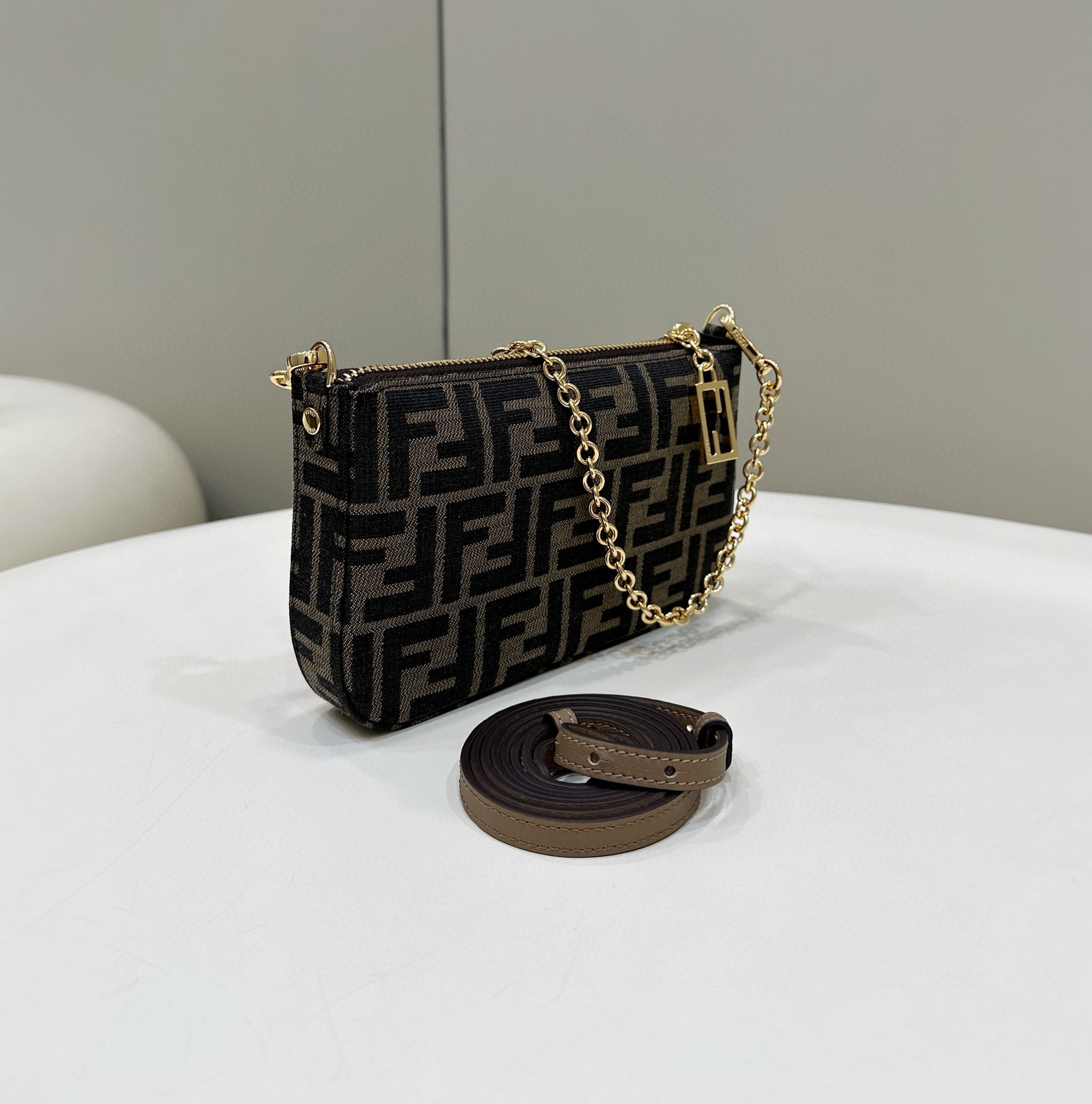 Baguette手拿包,配有可拆卸細鏈條,可手拿或腋下背攜。拉鏈開合,拉鏈頭飾有標誌性FF圖案。布料材質,帶有棕色和煙葉黃提花FF。金色飾面金屬件。意大利製造