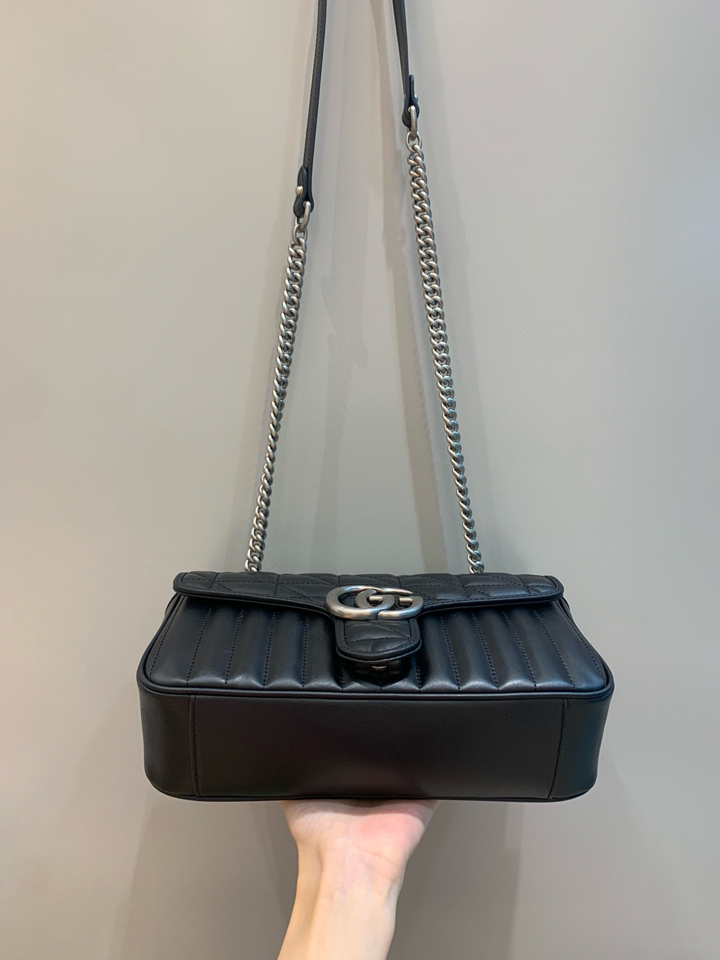 這款單品出自Gucci Lido系列,設計靈感源自意大利海岸的夏日風情和海灘俱樂部。小號GG Marmont鏈條肩背包采用頗具結構化的柔軟造型,超大號翻蓋扣配以雙G金屬配件。滑動鏈條包帶有多種背法,可在肩背和手提之間自由轉換。采用絎縫波V形花紋皮革,背面配以心形圖案。
