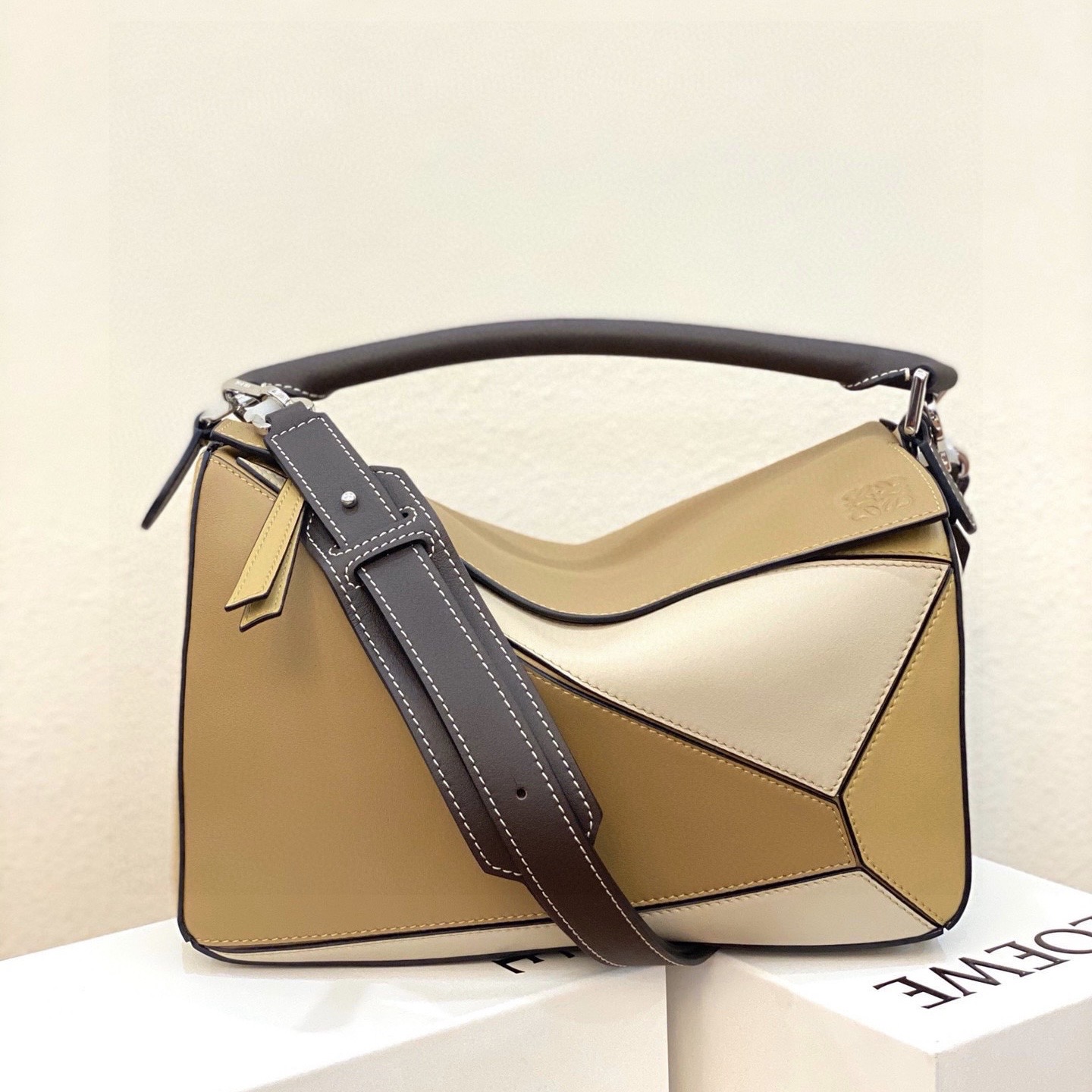 顏色: 奶黃色/灰米色/金色 Puzzle 手袋是創意總監喬納森·安德森(Jonathan Anderson)為 LOEWE 推出的首款手提包。長方體形狀和精確的切割技術創造了 Puzzle 獨特的幾何線條。這款小號手袋采用經典牛皮革製成,飾有重疊邊緣。