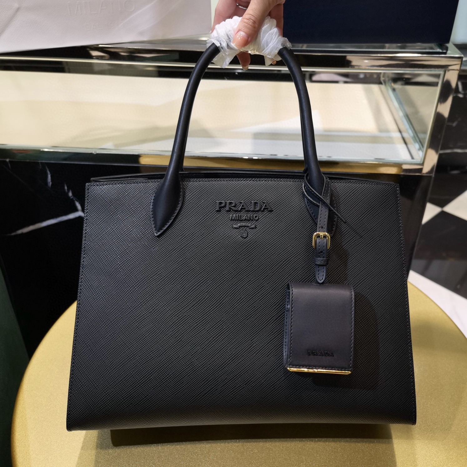 Prada包包Australia 官網專櫃價格圖片Monochrome大號手袋 Size:寬33x高24.5x底15cm 精致優雅簡約設計,以Saffiano牛皮 小牛皮製作,同色系的金屬刻字徽標彰顯包袋獨特設計。還帶有化妝小包包