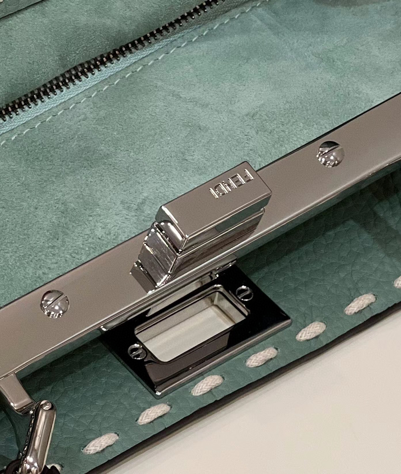 標誌性Peekaboo小號手袋,以220針同色系大號明線手工縫製而成,代表著源自1925年、由FENDI工匠世代傳承的Selleria經典工藝。甄選白色Cuoio Romano皮革和帶標誌性天然粒面的小牛皮,經不使用任何金屬的鞣製工藝製成。內裏帶有小牛皮內襯,以Cuoio Romano皮革硬質隔斷分成兩個外露內隔層,配有一個內袋。Selleria銀質標牌,銀色飾面金屬件。兩側飾有標誌性扭鎖。手袋配有手柄和可調節、可拆卸式肩帶,可手提、肩背或斜挎。意大利製