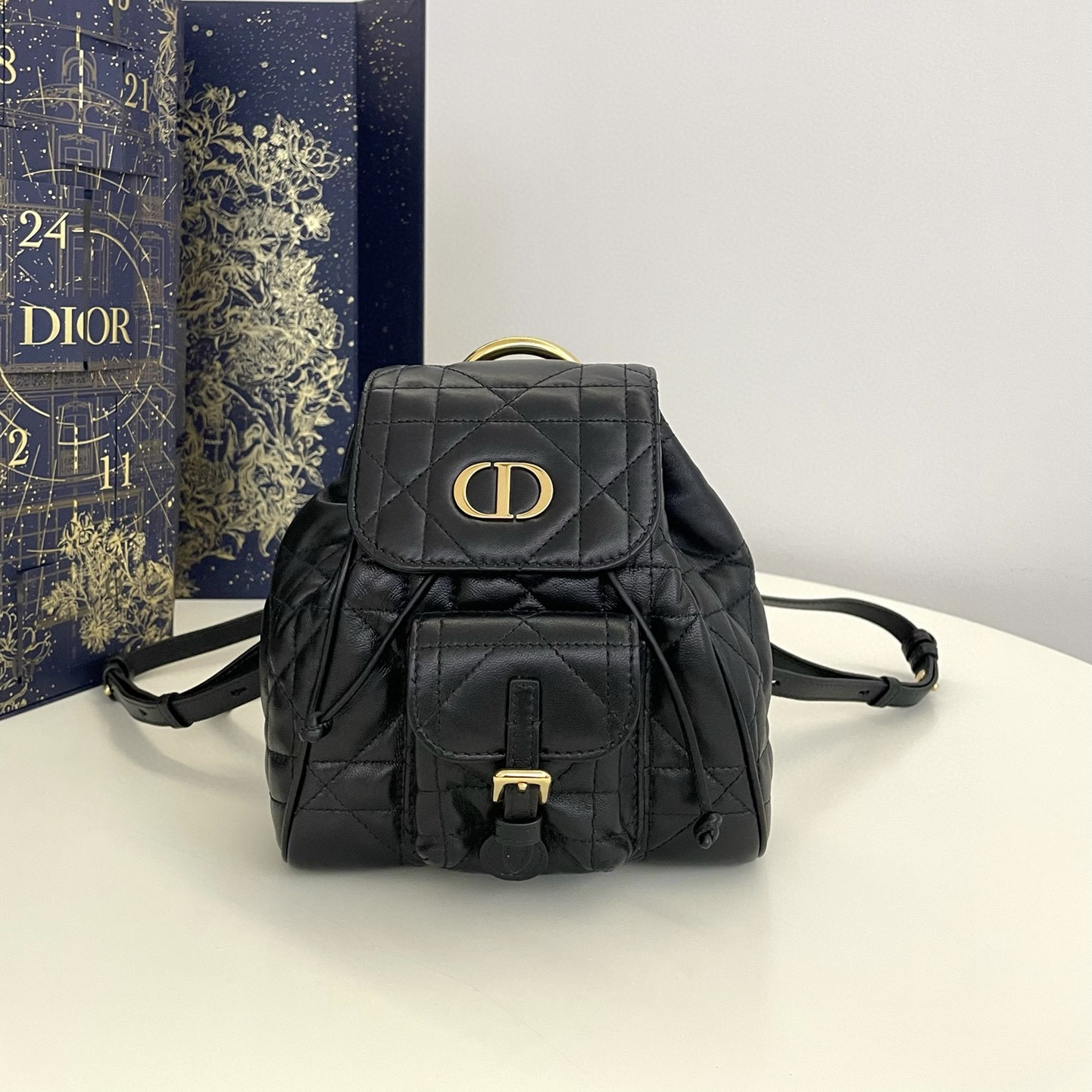 這款 Dior Caro 雙肩背包是二零二五早春系列新品,彰顯時尚優雅風範。采用黑色羊皮革等材質精心製作,搭配超大藤格紋緝面線提升格調,翻蓋飾以復古金色飾面金屬 CD 標誌,打開後則是抽繩主隔層,小號翻蓋口袋可收納各種日常用品。小號款式,搭配金色飾面手柄和可調節肩帶,更添舒適。