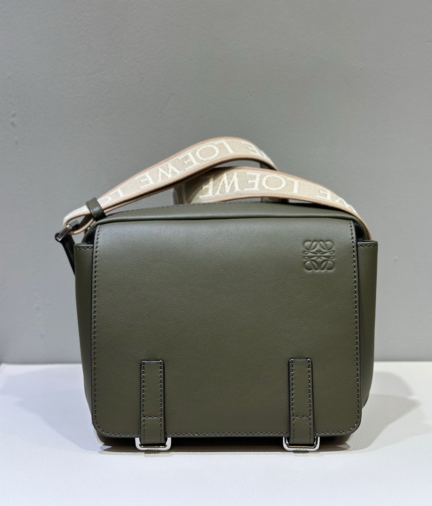 郵差包有一個拉鏈頂部隔層以及一個額外的前部翻蓋隔層。這個版本采用光滑牛皮革製成,配有 LOEWE 提花肩帶。