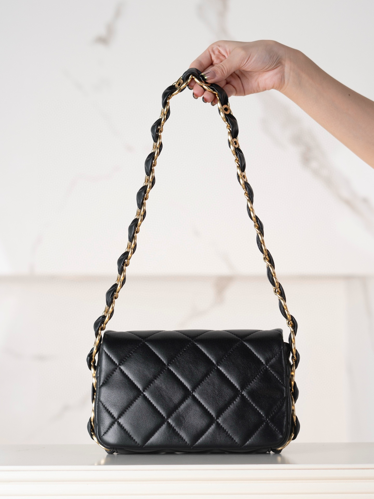 CHANEL包包USA官網價格圖片大全 新款24K迷你黑色粗鏈條腋下包 皮面為小羊皮材質,手感細嫩柔軟,肉感十足,皮面通透且呈現柔霧的光澤!復古時髦,無需費力搭配,輕輕松松就能營造出隨性松馳感 尺寸:20*11.5*5.5cm