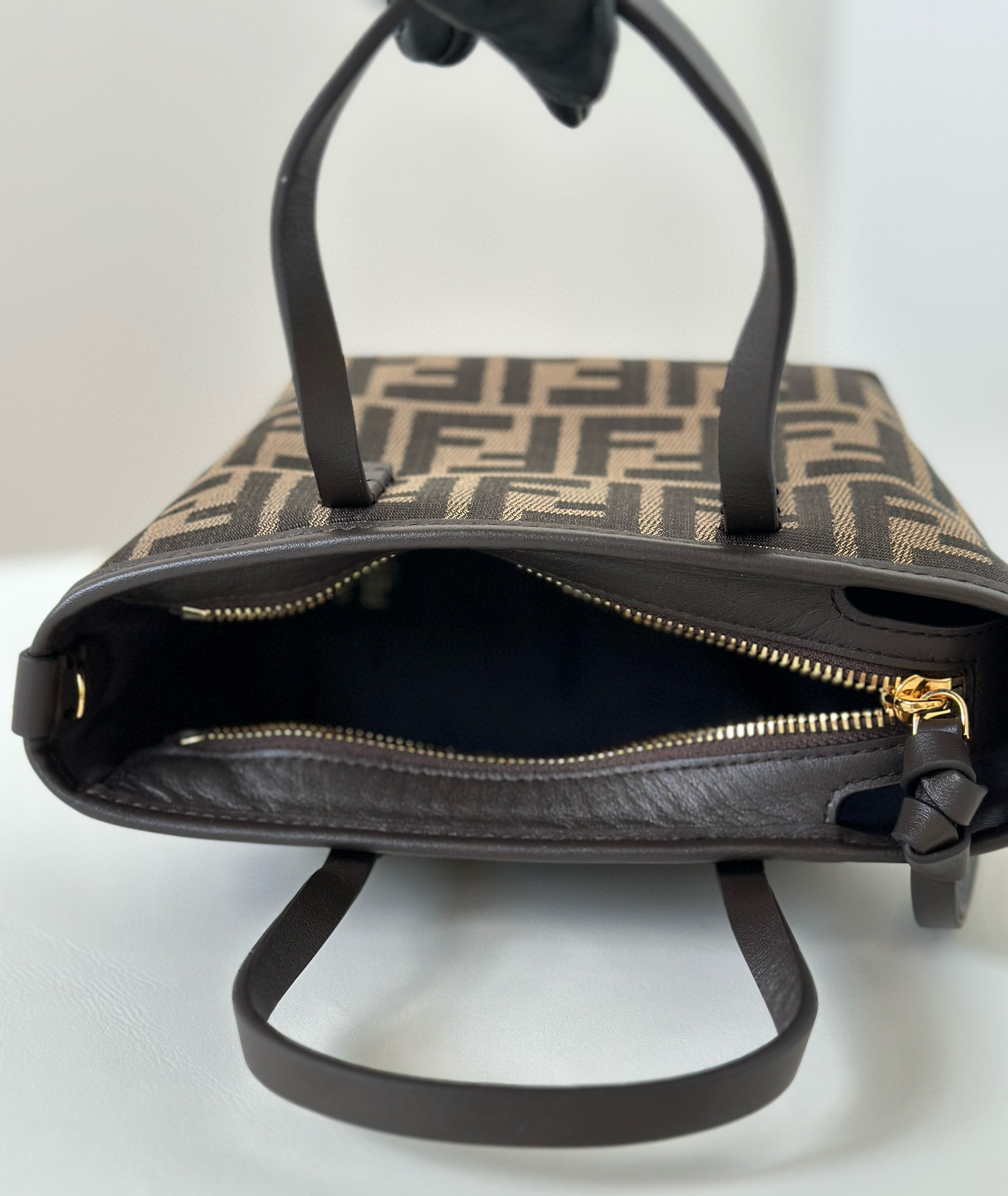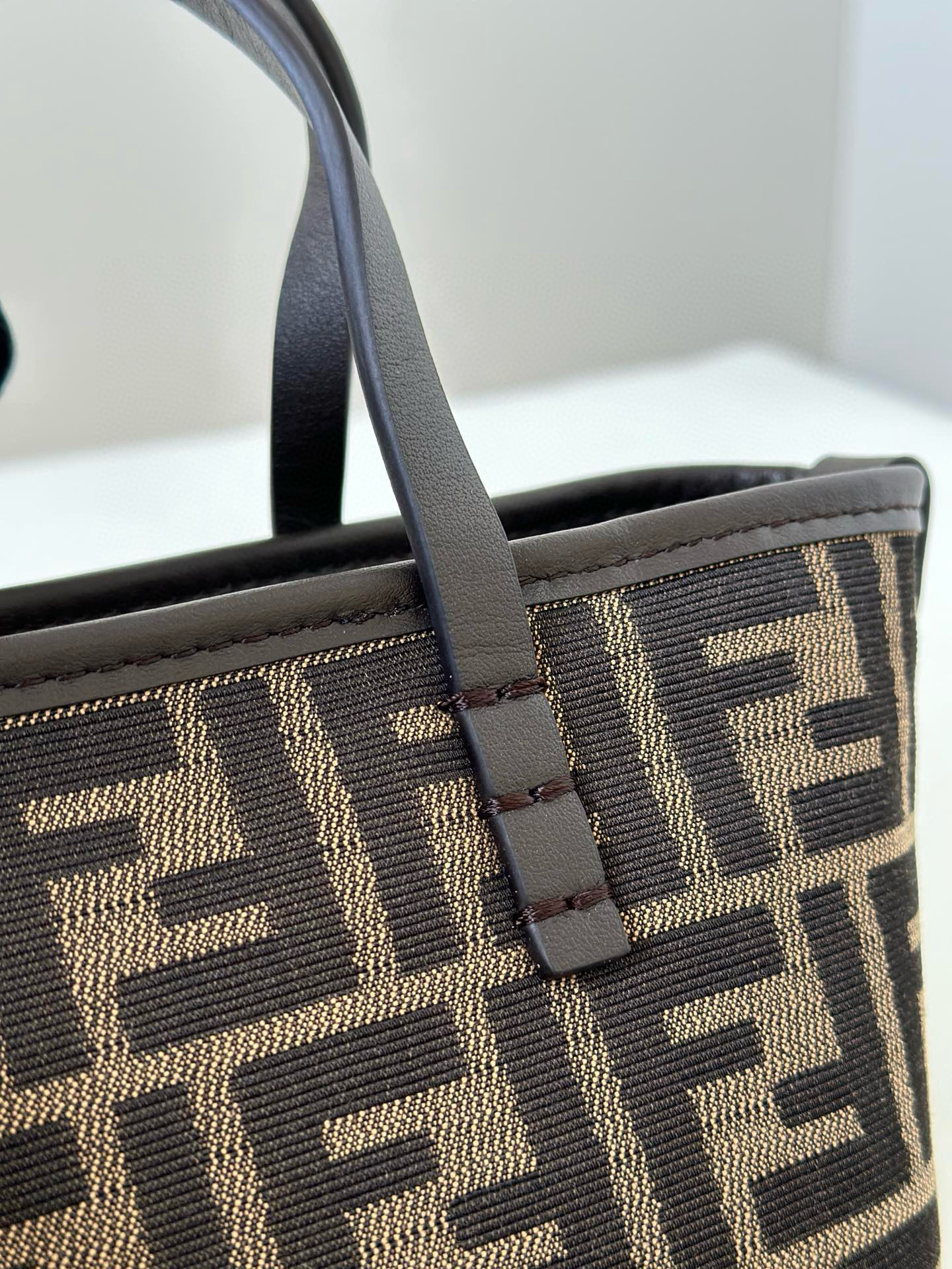 迷你購物袋,提花布料材質,飾有標誌性棕色FF圖案。飾以棕色皮革材質,配以拉鏈開合,帶打結皮革長拉鏈頭。