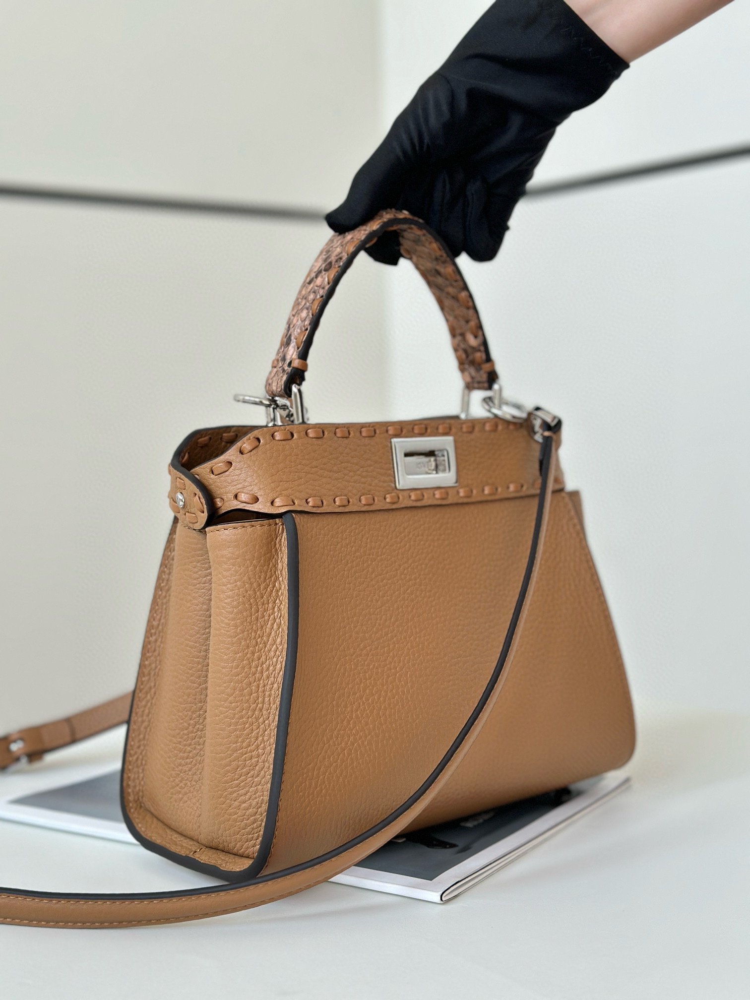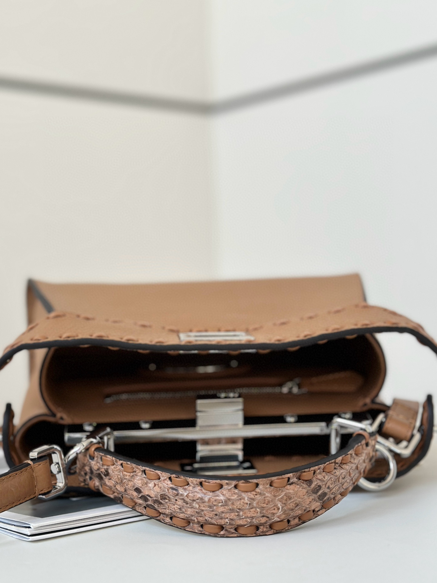 簡約大氣款peekaboo,特製的精美手工外縫突出包型撞色感,經典色彩與牛皮材質搭配蛇皮手腕是每個FD Girl的選擇~容量充足,日常出行一包搞定~