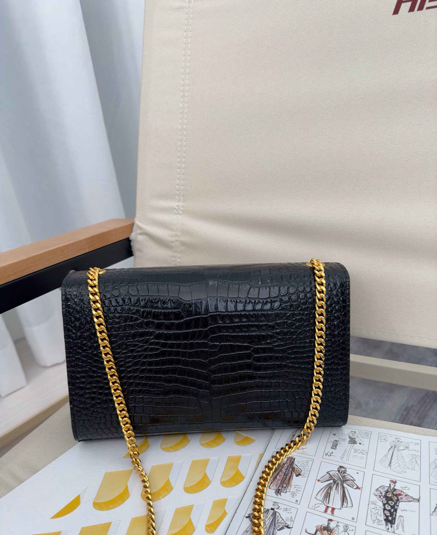 標誌性KATE手袋,采用粒面壓紋皮革製成,飾以LE CASSANDRE,搭配GOURMETTE鏈帶,可肩背或斜挎。