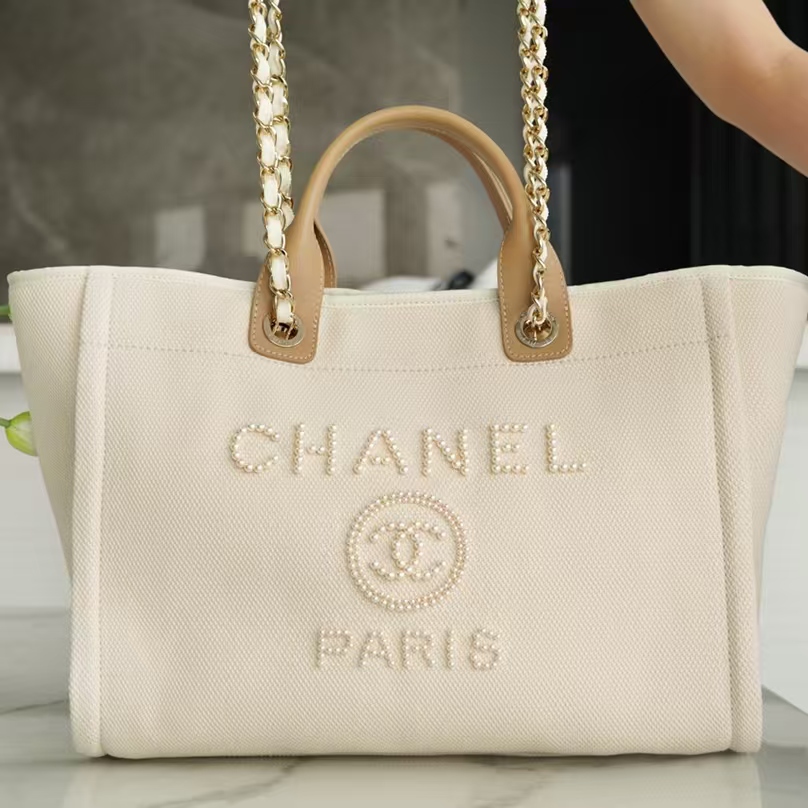 𝗖𝗛𝗔𝗡𝗘𝗟✦ 珍珠logo年度最美刺繡沙灘包 米白