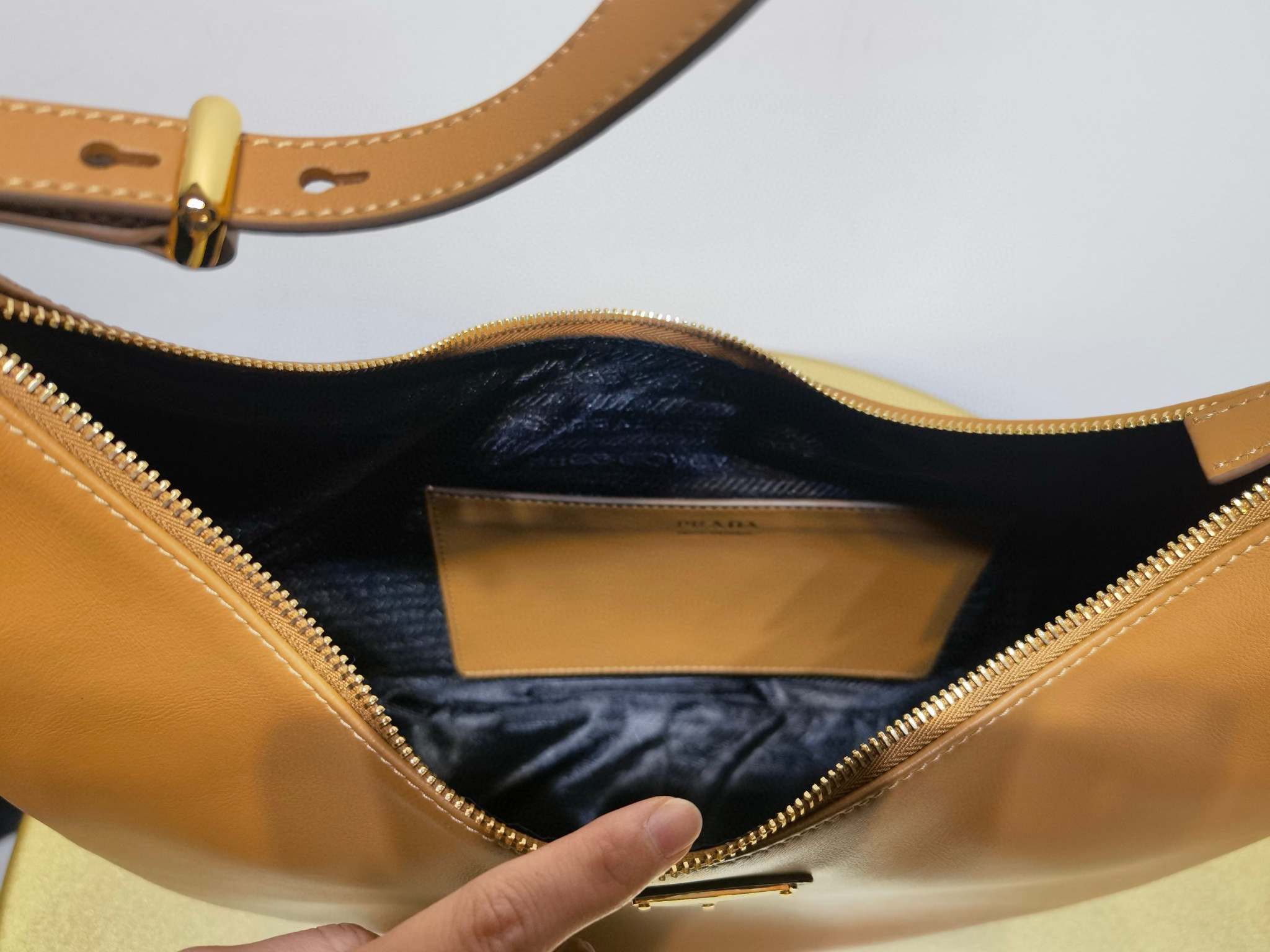 這款單肩包的設計靈感源自對Hobo廓形的探索,線條柔美,頗具現代感。圓潤的包型結合大容量的設計,非常實用且百搭。軟羊皮內裏,金屬五金配件點綴其間。✅可調節提手,並配有可調節長肩帶,可單肩可斜挎。塗琺瑯三角形金屬徽標則為其賦予經典格調與精致風範